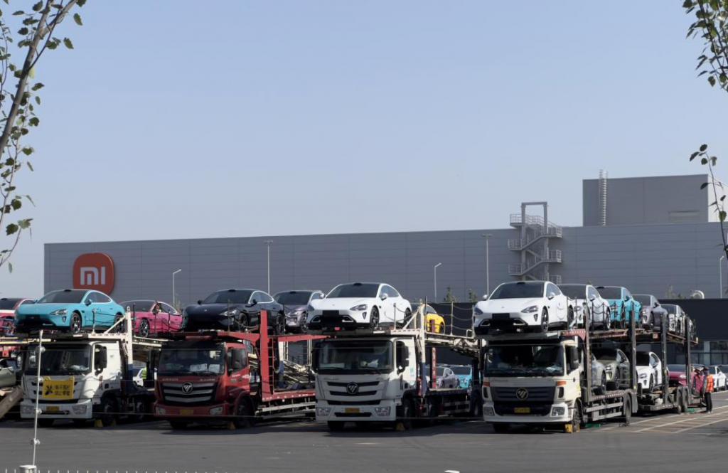 时代周报记者注意到,一辆卡车可以装载 9 辆小米 SU7。按照小米 4 月交付约 2.8 万辆汽车计算,平均每天有超 900 辆新车运出厂外,单日约需近百辆卡车。据周边网约车司机说,这是厂内的日常。