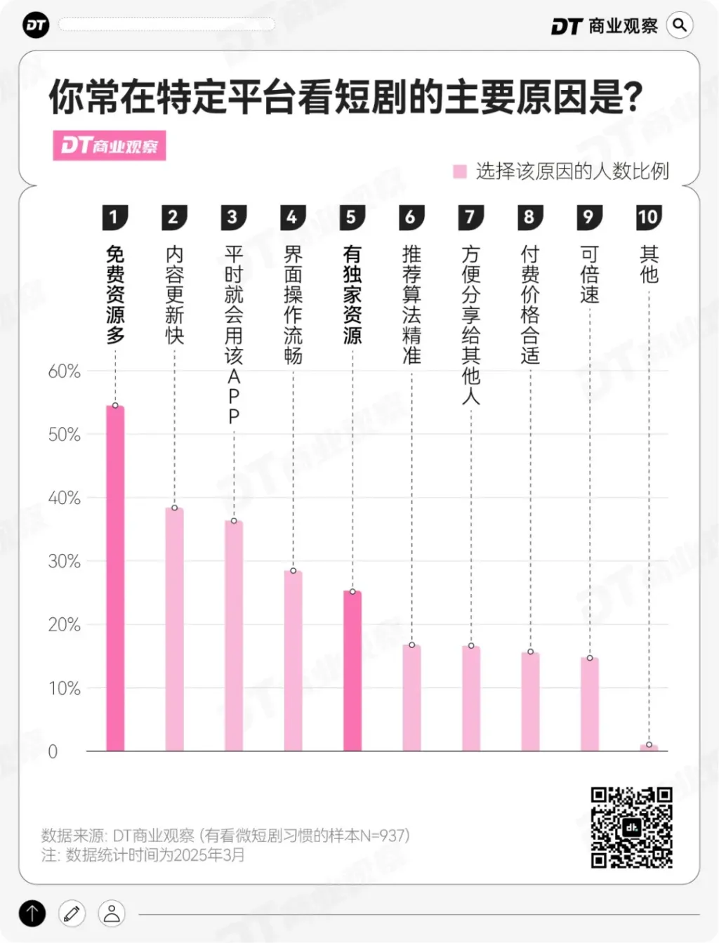为什么是这些平台呢?倒不是因为“有独家资源”,而是因为“免费资源多”(54.5%),“内容更新快”(38.4%),以及“平时就会用该APP”(36.4%)。
