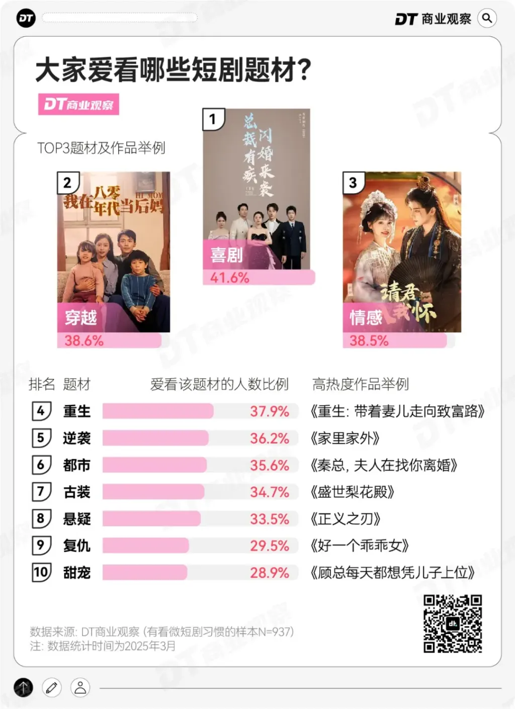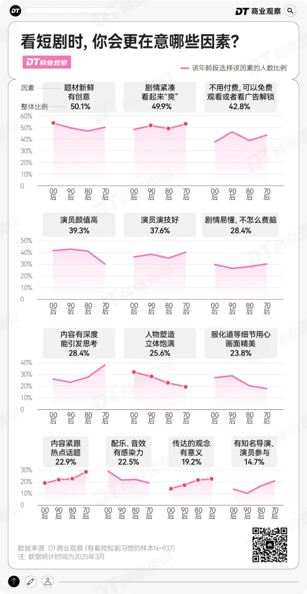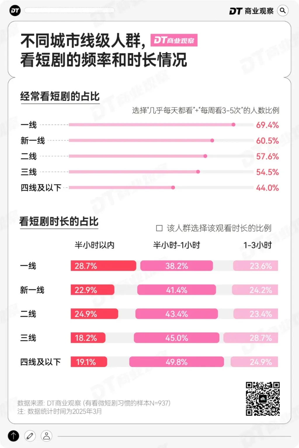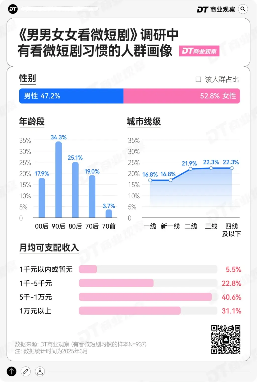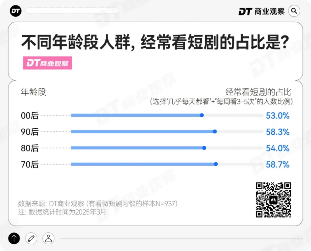 《DT商业观察》联合第一财经发布了《“当代男男女女看微短剧”小调研》,最终有效样本有1137份,有看短剧习惯的人数为937,几乎不看的人数为200。