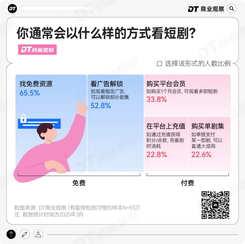 最多人看短剧的方式,首先是找免费资源(65.5%),其次是看广告解锁(52.8%)。