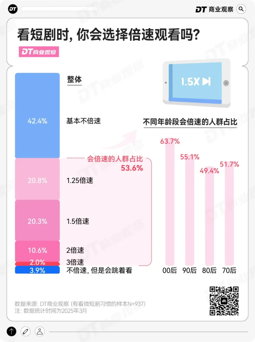 从00后到80后,越年轻,选择倍速观看的比例越高,63.7%的00后都会倍速看短剧。