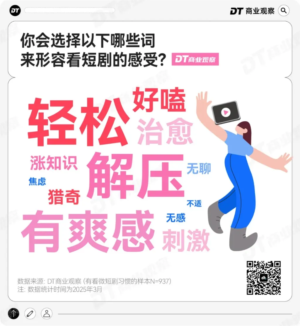 大家看短剧的感受,集中在轻松、解压、有爽感,选择“无聊”“无感”“不适”等负面情绪的比例均低于10%。