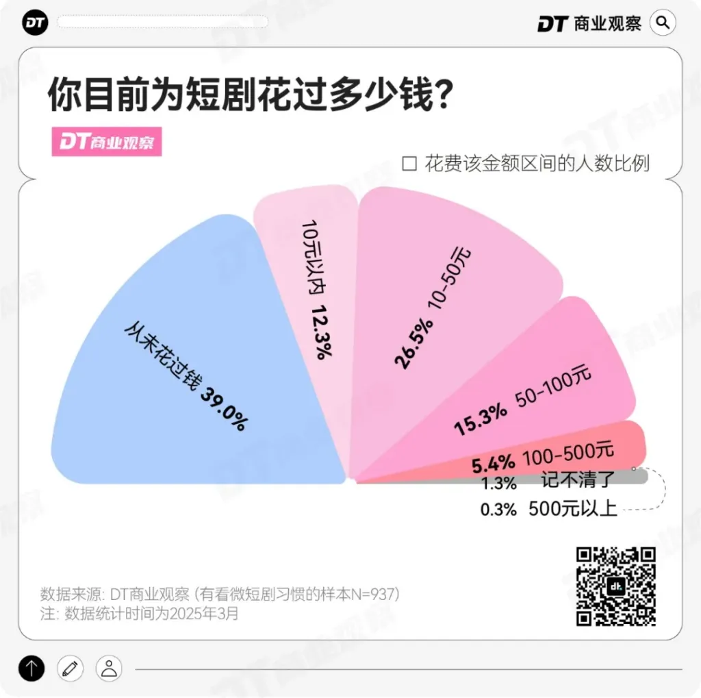 调研中,近6成人给短剧花过钱,但近4成人为短剧花过的钱在50元以内,远远谈不上“疯狂氪金”。