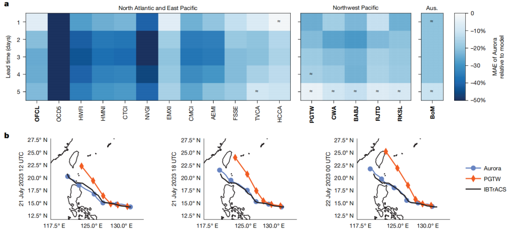 在实际应用中,Aurora在热带气旋预测方面的表现优于当前最先进的预测系统。图摘自研究团队论文
