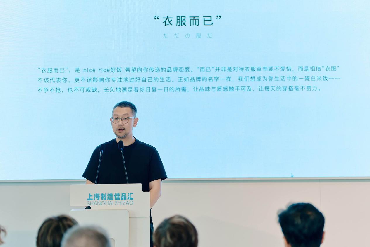 作为上海优秀的时尚生活方式类服装品牌“nice rice好饭”,也带来了“衣服而已”的极简生活哲学分享,引发年轻消费群体共鸣。公司总经理姜军生介绍称,上海淮海路旗舰店提出“屋檐下”理念,表达包容与庇护,用国家级非遗蛋壳漆工艺打造白条收银台,获得了日本天空设计奖2024金奖。
