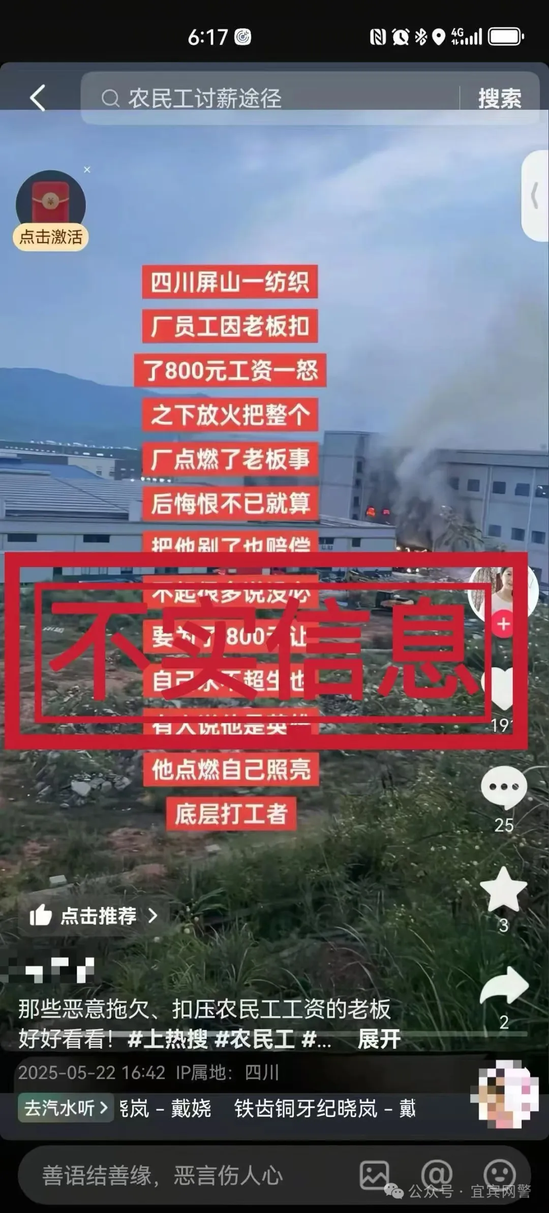 2025年5月22日,翠屏区网民何某某(女,48岁)在短视频网络平台发布一张厂房起火图片并配文称:“四川屏山一纺织厂员工因老板扣了800元工资,一怒之下放火把整个厂点燃。有人说他是英雄,他点燃自己照亮底层打工者”,引发网民关注和议论。经核查,何某某为吸引流量、博人眼球,编造了“因800元工资放火点燃工厂”的谣言信息,造成不良社会影响。何某某对其违法行为供认不讳,屏山县公安局已依法对何某某处以300元罚款。