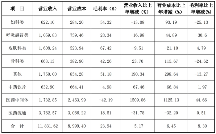 中药饮片业务同样亏损,营业收入比上年同期减少67.46%,毛利率为-4.98%。