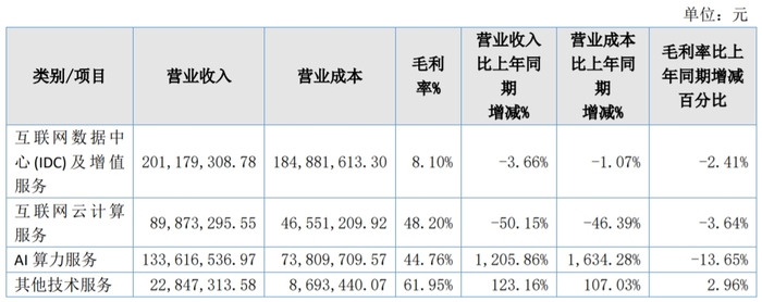 AI算力服务业务(占比总营收的30%)营收增幅达1205.86%,但毛利率减少13.65%至44.76%。