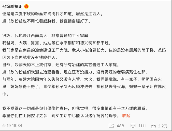 《旋风少女》编剧祝明针对娱乐圈二代进行过这样的发言:“早就等着扒她家(指虞书欣家)的瓜了,该来的终归要来的。这么说吧,影视行业所有卖“家境富裕”人设的,顺着查一遍,99.99999%都有料。”这一条微博获得了4.6万赞。祝明对虞书欣家庭的情况非常上心,一大原因是她和虞书欣一样都生活在江西的钢铁产业之家,前者生活在南昌的冶金建设工厂大院,而这里年久失修,居住条件差,工人下岗陷入贫困,而在此情况下,虞书欣的爷爷“就是爱跳舞的可爱富裕小老头,还能去上海买豪宅”。虞书欣家人的财富从何而来,与祝明和她关心的人们有着切身的关系。而对于黄杨钿甜的耳环事件,网友们最为关心的是,为何雅安地震之后,有人没有得到即时的救助,一个公务员家庭却可以拥有如此多的家产。许多网友都分享了当初给震后雅安捐款的故事,这意味着黄杨钿甜的耳环究竟是否来源于地震拨款,对网友们来说有着切身的重要性。然而,这些事件的真相却因为涉及具体人物的发家史,是极为不透明的。