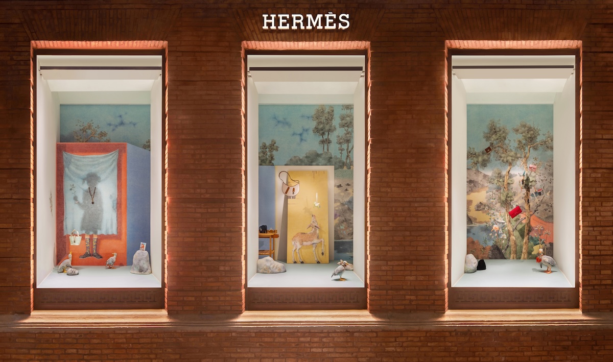 在爱马仕之家的入口处,岛屿浮现,苔色蔓生,引观者移步入画;橱窗陈列借助卷轴般的视觉效果展开,青松、圆窗、拱门、太湖石和山鹿、花枝交相辉映,呈现自然的透彻和轻盈之时,也赋予了爱马仕手袋、鞋履和配饰灵动鲜活的质感。