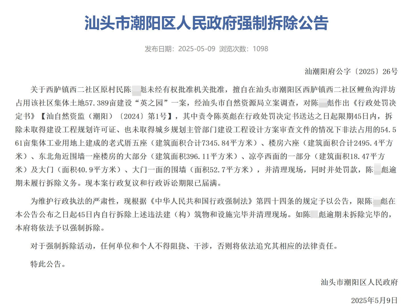 此前,5月9日,广东省汕头市潮阳区人民政府发布强制拆除公告,称西胪镇西二社区原村民陈某彪未经批准,擅自占用该社区集体土地57.389亩建设“英之园”。
