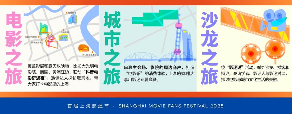 “电影之旅”,串联大光明、和平影都等历史影院及外滩、南京路等露天放映点,更有“抖音电影奇遇夜”全上海奇遇电影 Movie Walk活动,让影迷亲身走进电影画面;