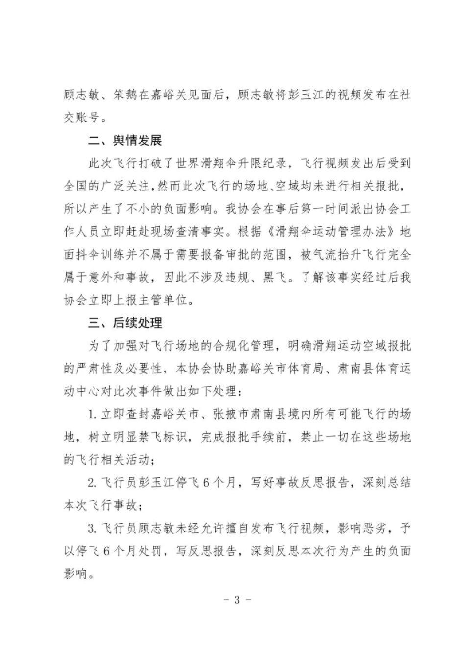 此外,报告显示,该协会协助嘉峪关市体育局、肃南县体育运动中心对此次事件做出了多项处理:飞行员彭玉江停飞 6 个月,写好事故反思报告,深刻总结本次飞行事故 ; 飞行员顾志敏未经允许擅自发布飞行视频,影响恶劣,予以停飞 6 个月处罚,写反思报告,深刻反思本次行为产生的负面影响。