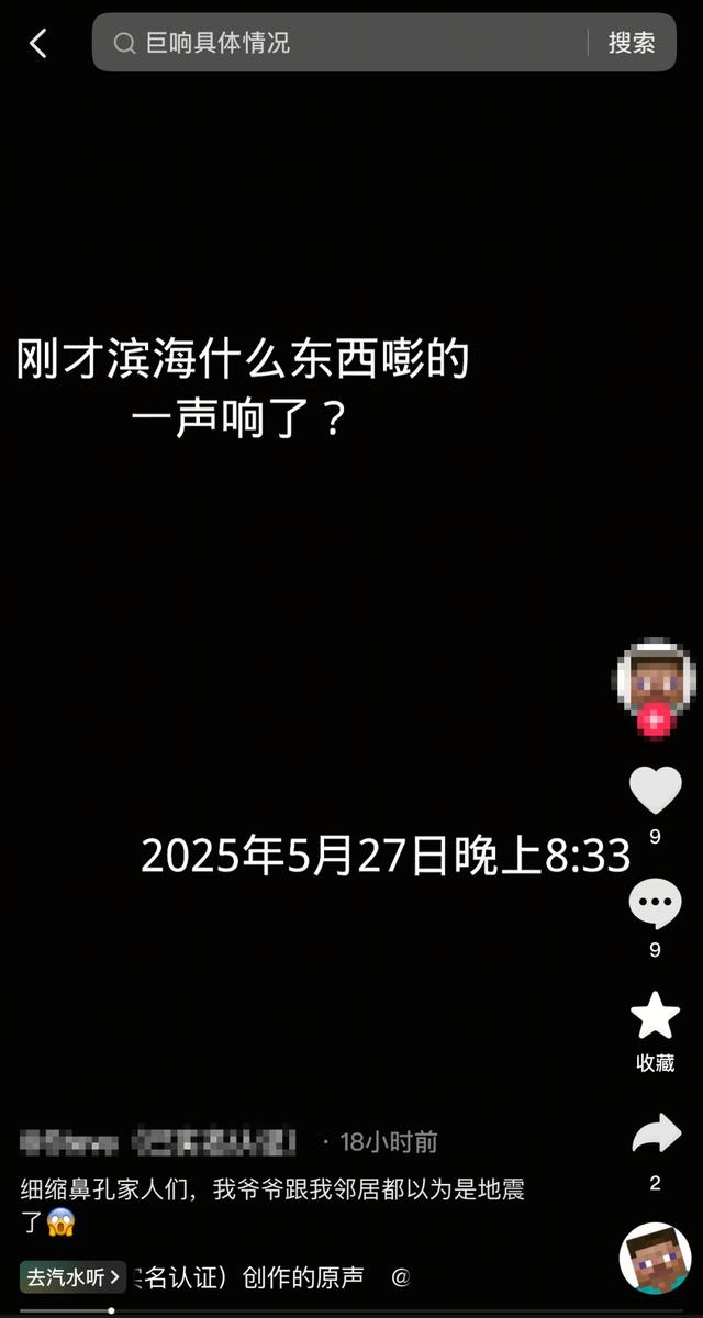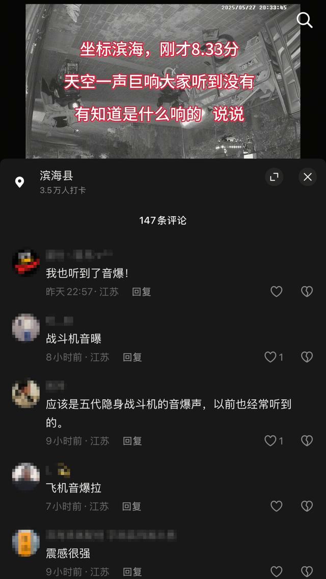 记者搜索发现,当天多名网友发视频称,在晚上 8 点 33 分左右,江苏滨海突然发出一声巨响,不少网友纷纷表示:" 飞机音爆?"