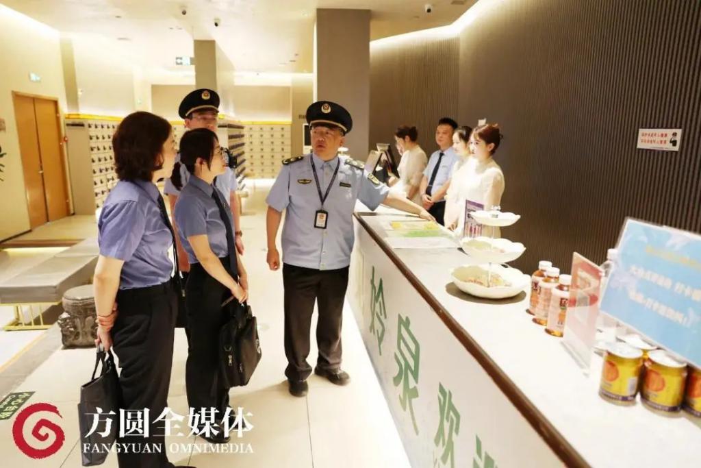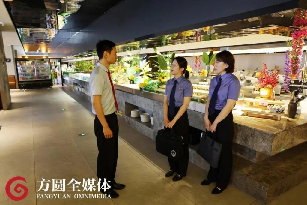 海淀区检察院检察官与海淀区市场监督管理局工作人员正在交流,了解自助餐厅执行不向未成年人售酒制度的情况。