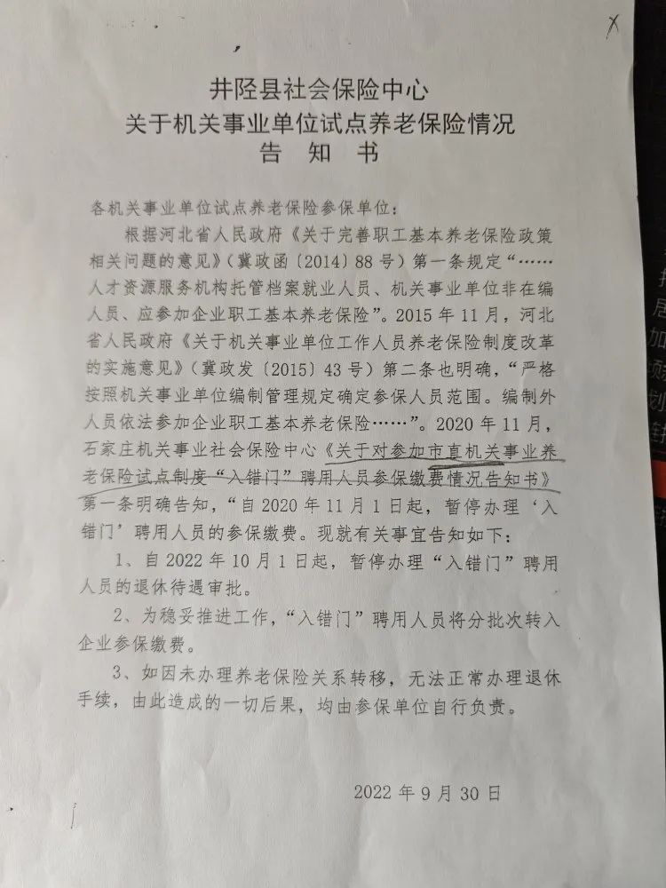2020年11月,石家庄机关事业社会保险中心《关于对参加市直机关事业养老保险试点制度“入错门”聘用人员参保缴费情况告知书》第一条明确告知,“自2020年11月1日起,暂停办理‘入错门’聘用人员的参保缴费。现就有关事宜告知如下:自2022年10月1日起,暂停办理“入错门”聘用人员的退休待遇审批;为稳妥推进工作,“入错门”聘用人员将分批次转入企业参保缴费;如因未办理养老保险关系转移,无法正常办理退休手续,由此造成的一切后果,均由参保单位自行负责。