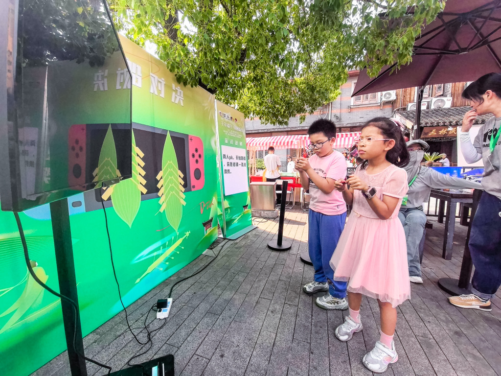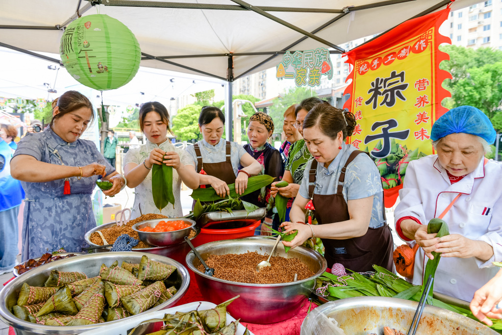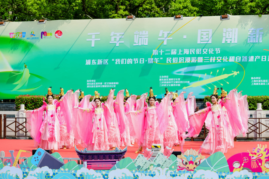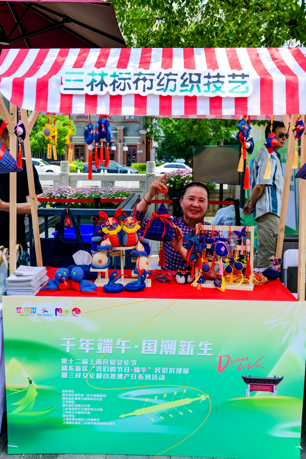 三林塘老街充满江南水乡风情,龙狮会馆彰显着龙狮之乡的传奇。这里不仅有地道的民俗表演,碧波荡漾的长长河道也为百舸争流的龙舟竞技提供了条件。如今三新路至长青路段的河道已成为龙舟基地。这次端午活动除了有龙舟表演,还有观众可参与的皮划艇体验以及繁花烂漫的三林花船,可供市民、游客欣赏和打卡。岸上,三林镇的巧姑手把手教游客包粽子,还有“粽情粽意”钓粽子游戏以及“龙舟急行”的电视体感游戏给小朋友体验。传统文化与现代科技结合,延展了划龙舟与包粽子等纪念爱国诗人屈原的端午习俗。