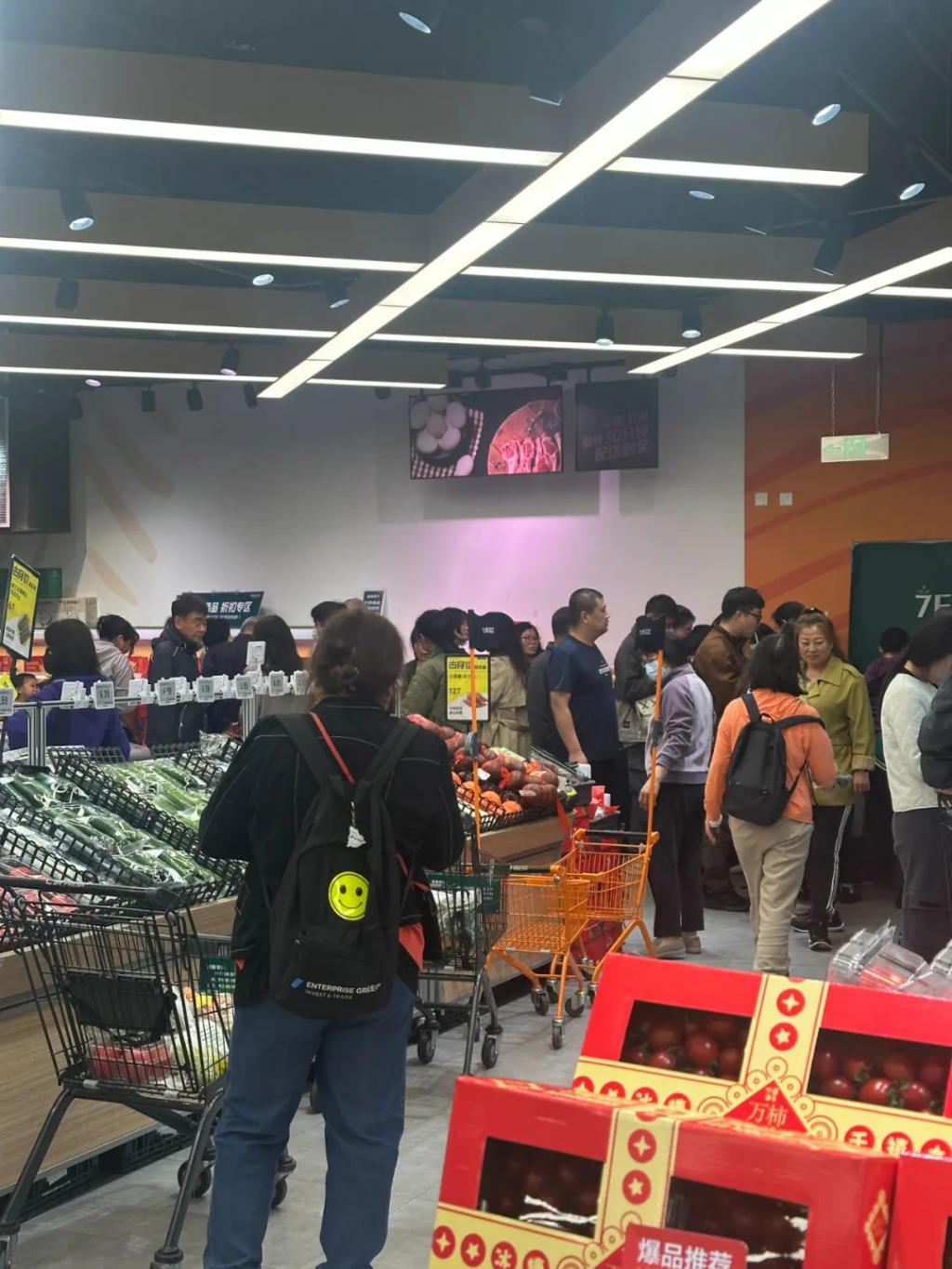 4 月 21 日晚上的 8:07,刚下班的李夕匆匆赶到北京姚家园万象汇地下一层的七鲜超市,虽只晚到了 7 分钟,但人已经多到连购物车都不够用了,她只能提着购物筐挤进人群。不知已经进行了几轮争抢,现场一片混乱。晚 8 点,这家超市准时开始每晚的日清(即每日清空库存,避免商品隔夜销售),虽然是工作日,超市里也呜呜泱泱全是人,和楼上冷清的商场形成了鲜明对比。