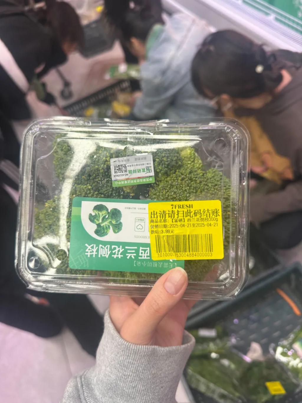 我是在 8:02 进入超市的,比李夕早 5 分钟。大爷大妈们已经开始了抢夺,力气难以与之抗衡的我,一直在外部徘徊,等人群散开后,才看到地上摆着几个箱子,里面有打折的当归菜、有机西兰花、富硒芹菜,以及一堆我叫不上名的绿叶菜,都是半价。至于网友们推荐一定要抢的 49 元 6 盒的蓝莓,50 元出头的大连美早樱桃,早就没了。