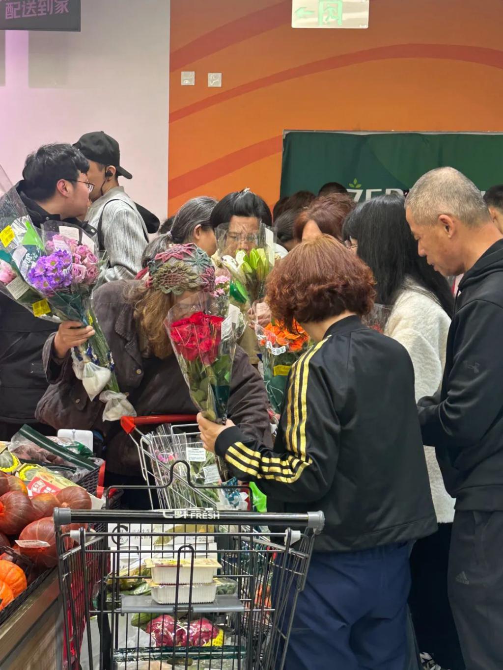 有些大妈甚至组成了抢货团——当鲜花这类最后一波清仓品被工作人员用小推车从仓库推出来,有两位大妈合作默契,一位在前线抢花,一位在后面值守,看着购物车里的 " 宝贝 "。前线的大妈抱着至少十束花走到购物车旁,和她的伙伴一起选了选,最后留下三束放进了购物车,剩下的重新扔回了小推车。