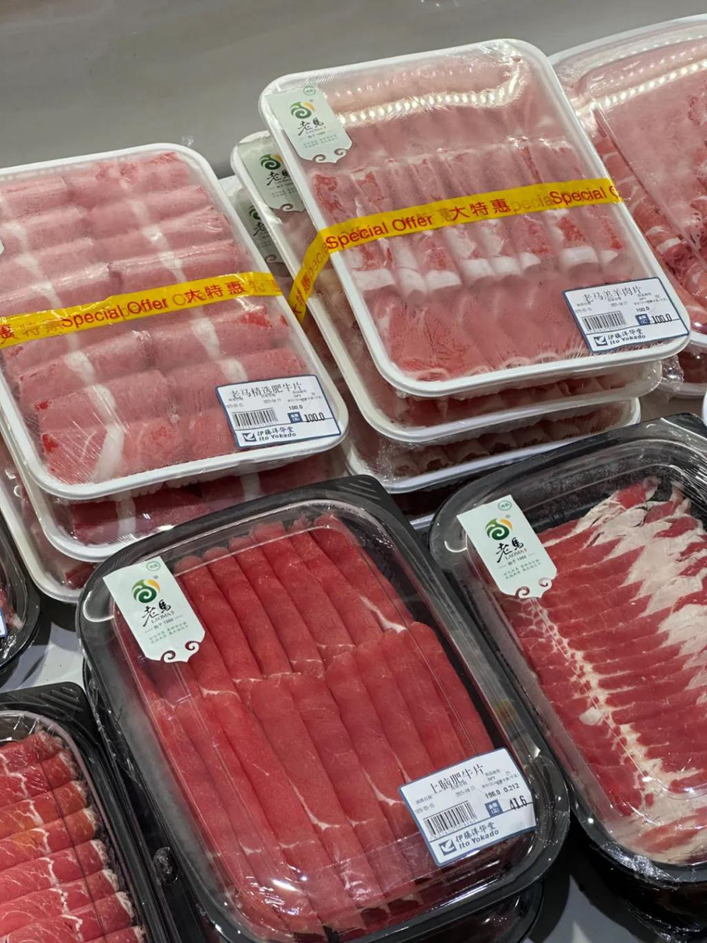 刚进超市,没看到一位消费者,只看到一位工作人员支着小摊卖排骨,吆喝 3 盒打包买走只要 136 块," 如果想要的话,再送你一盒。"这跟七鲜的火爆场景简直天壤之别。再往里走,还有一批低价肉,100 元可以买到 5 盒 110g 左右的牛肉或 4 盒 280g 的猪肉。