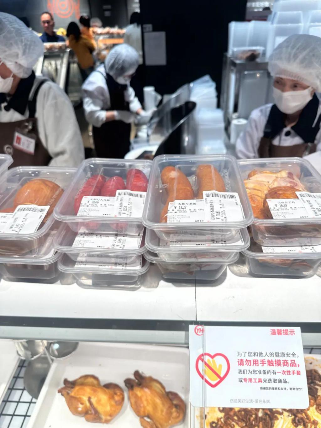先映入眼帘的零食区,没多少人。但往里走后,才发现是我 " 轻敌 " 了——人都聚在熟食区和烘焙区。所有打折食品被摆在柜台上方,有猪耳朵、羊头肉、小龙虾、鸭脖、大拌菜等 …… 白天没卖完的产品都会打折促销,品类比七鲜还丰富。