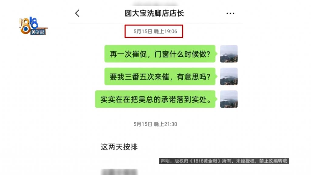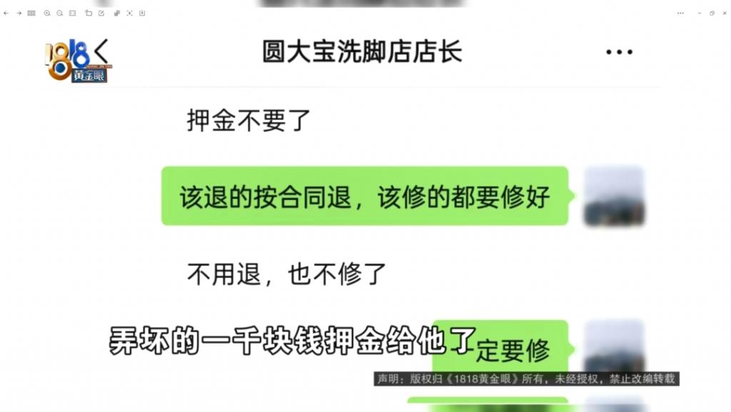 稍晚些时候,吴老板给记者回短信表示,店长要求钟先生先退还押金,他们一定会修好房子。因为租赁宿舍属于员工私事,他也只能要求员工多配和房东处理好。钟先生不接受这样的说法,后续他会向属地职能部门投诉,也不排除走司法途径,起诉修脚店所属企业。