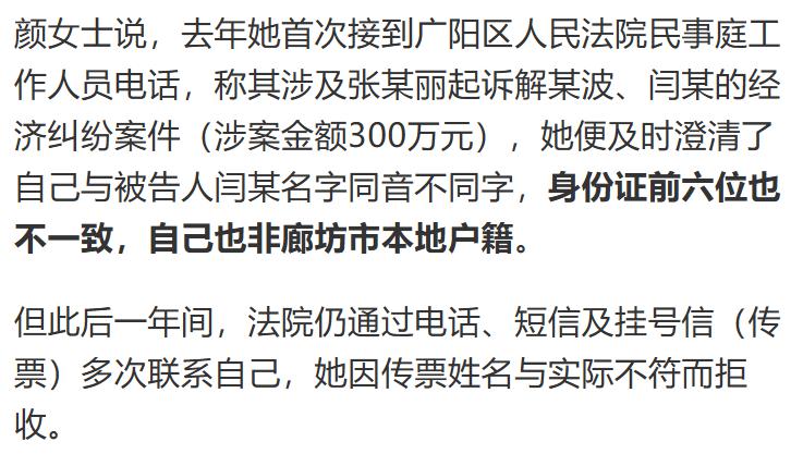近日,河北省廊坊市的颜女士向媒体反映,因其身份信息被错列为一起经济纠纷案件被执行人,两年内多次被廊坊市广阳区人民法院核查、传唤,甚至在其多次澄清后,执行局工作人员仍携民事判决书到其工作单位调查。