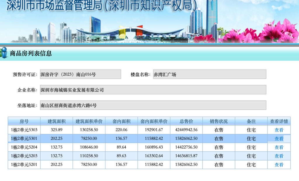 澎湃新闻记者了解到,涉事楼盘“赤湾汇广场”(现名为“南山1978半岛擎峯二期”)的开发商为深圳市海城锦实业发展有限公司。在深圳市市场监督管理局的“商品房列表信息”中查询看到,该楼盘目前仍处于“在售”状态。