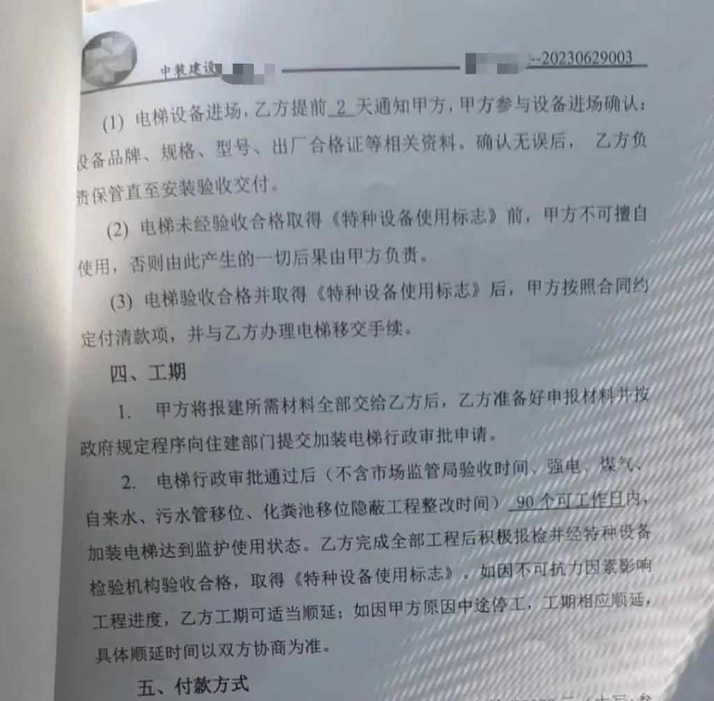 4 日,记者在现场看到,涉事 3 座电梯尚未完工,2 座为停工状态,1 座正在施工。业主代表徐女士介绍,2023 年 7 月,业主们与湖南中装三湘电梯工程有限公司签订电梯安装协议,约定工期为:相关审批通过后,在 90 个可工作日内,加装电梯达到监护使用状态。" 当年 11 月过了审批,所以按约定是 2024 年 4 月完工,到现在已经逾期一年多了。" 徐女士说。