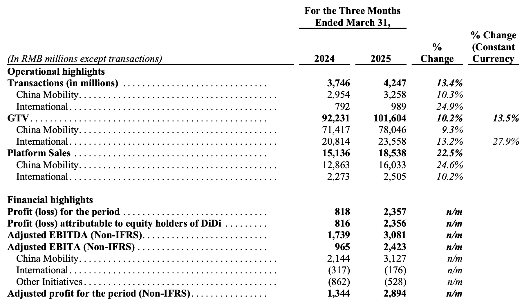 值得一提的是,滴滴的国际业务在高速增长的同时,亏损逐步收窄,其中国际出行业务一季度经调整息税摊销前(Adjusted EBITA)实现盈利。