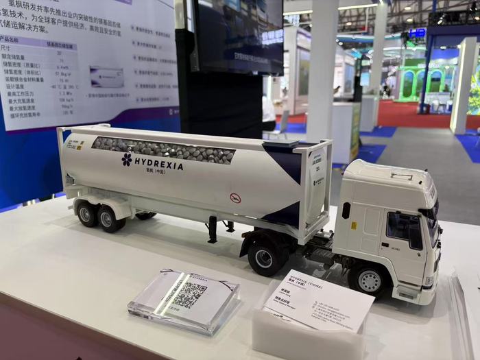 此次上海碳中和博览会上,上海氢枫能源技术有限公司(下称氢枫能源)展出了全球单系统储氢量最大的固态储氢车——镁基固态储运氢车。