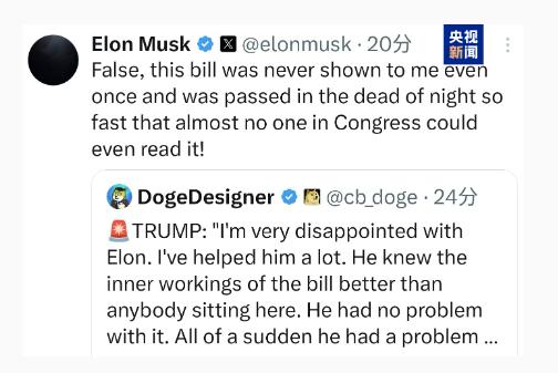 在特朗普发表对马斯克的评价后,马斯克迅速在社交媒体上回应并反驳称,"大错特错,这项法案一次也没有给我看过,而且是在深夜迅速通过的!