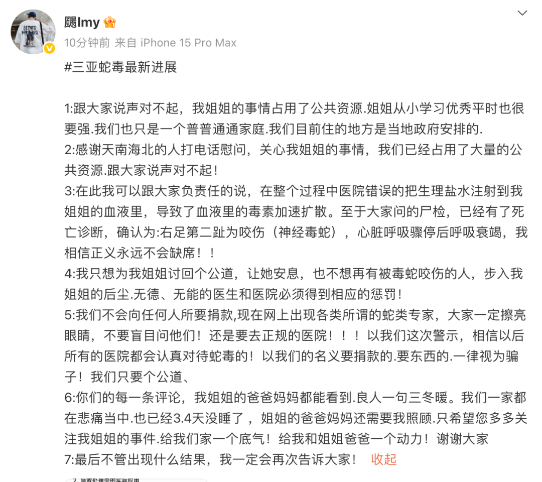 6月6日 ,当事人弟弟 @颺lmy 再发文,大家比较关心的“尸检”,已经有了死亡诊断,确认为右足第二趾为咬伤(神经毒蛇),心脏呼吸骤停后呼吸衰竭。同时,我们不会向任何人索要捐款,现在网上出现各类所谓的蛇类专家,大家也不要盲目相信他们,出现被蛇咬伤的情况还是要第一时间去正规医院。