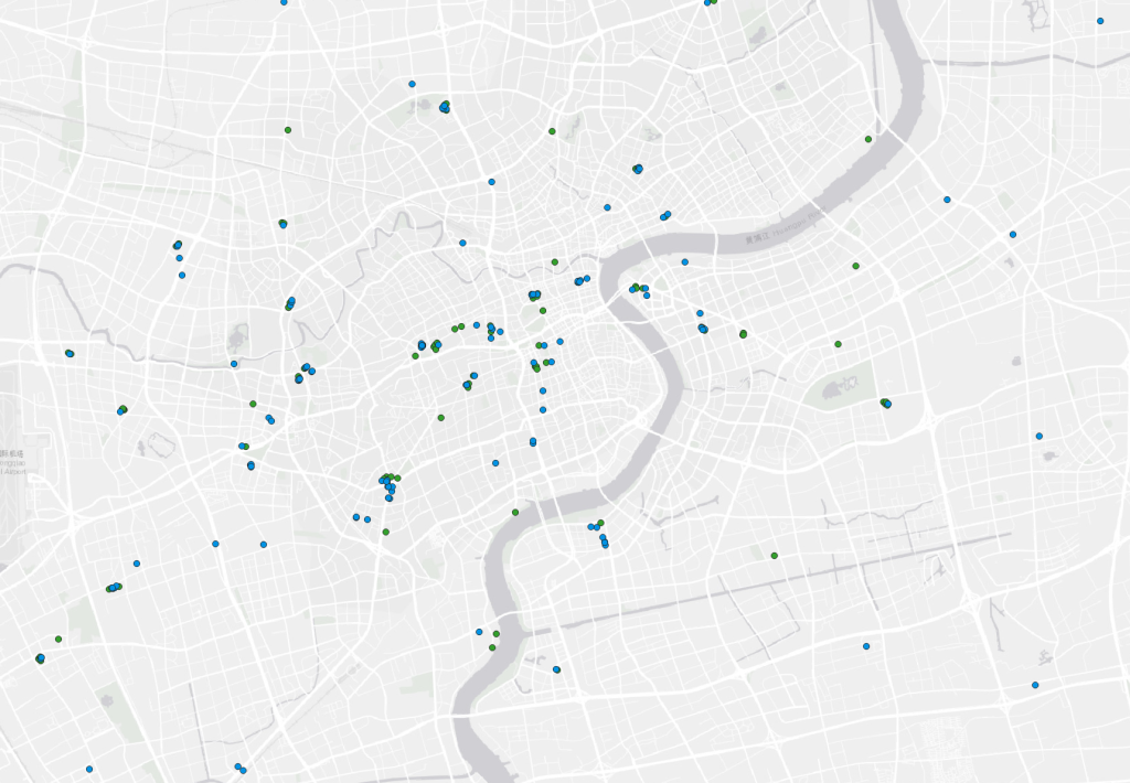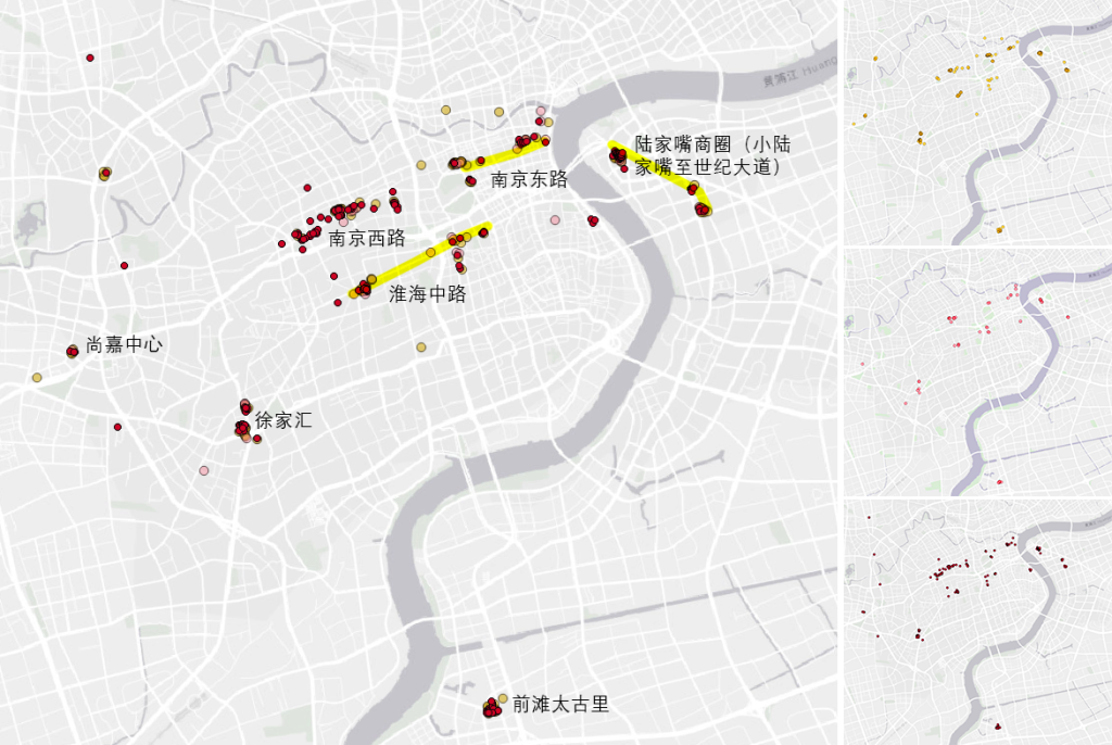 胡润排行榜中的高级户外、电子、家居店铺的分布比奢侈品更不规律,淮海路除了“割裂”之外并没有特别明显的短板,可以考虑做一些增量规划。数据来源:百度地图 制图:赵忞