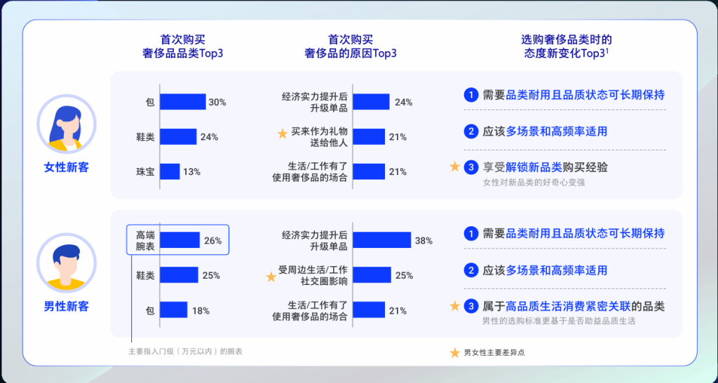 《中国奢侈品市场洞察报告》(2024)中国内初次购买奢侈品的人群的偏好,表现出强烈的实用主义特点。