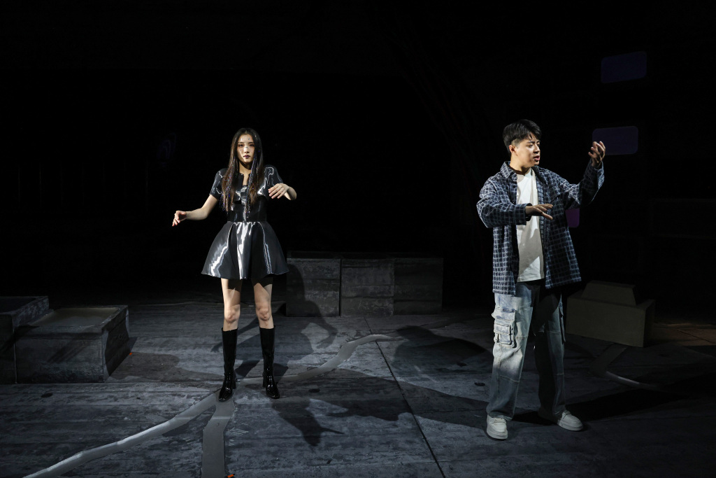 演出剧照 演员王君瑞(左)、张鑫名(右)一人分饰多角