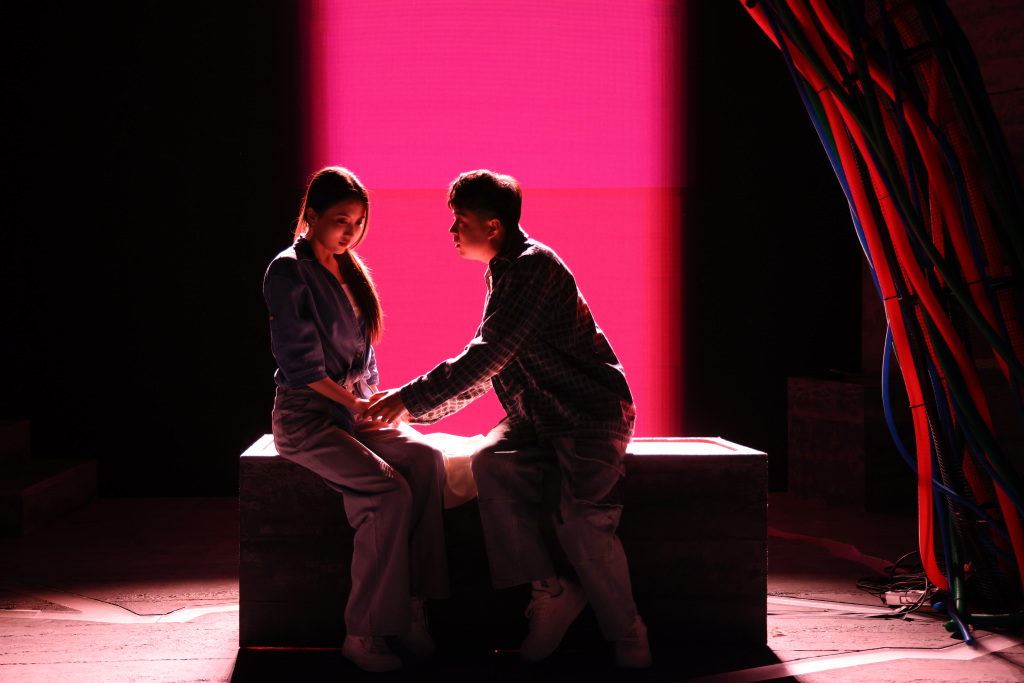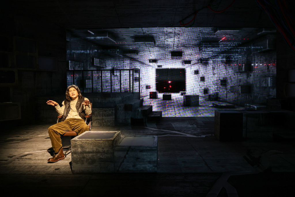 “另外,相较于人艺过往的创作题材,这也是我们第一次触及科技领域、人工智能的概念。”就澎湃新闻记者现场观摩,水泥色基调的舞台此次被打造成了极富隐喻的空间——它既是承载数据的电脑机箱,又是高速运转的AI大脑,里面充斥着各式各样的数据流与切片样本,穿破顶部的树状电缆同时也是神经中枢。而具体的人物角色则化作现代文明的病理切片,为观众展现出数字时代的生存图景。