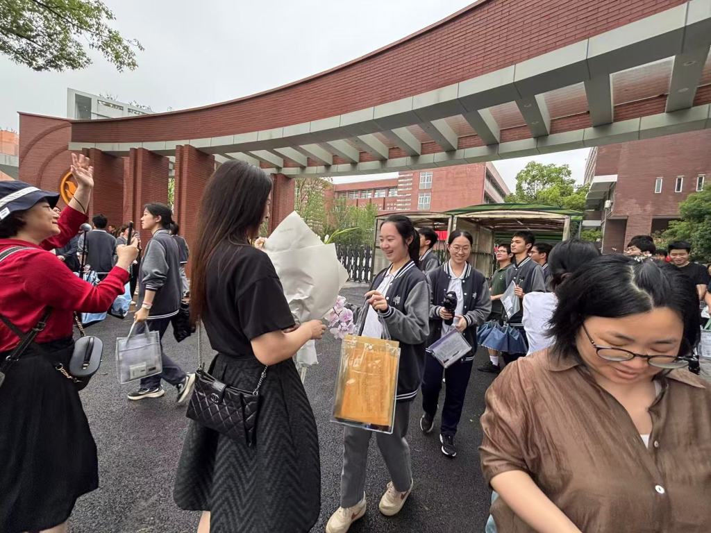 6月9日下午,上海市杨浦高级中学考点,随着外语听说测试结束,考生们陆续走出考场,家长们送上鲜花和拥抱。
