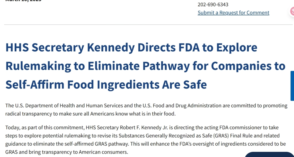 当地时间3月10日,美国卫生与公众服务部(HHS)曾在官网发布新闻称,HHS部长Robert F. Kennedy Jr.指示FDA探索修订《公认安全(GRAS)》的最终规则(Final Rule)及相关指南,以取消企业“自我认证GRAS”路径。Kennedy表示:“长期以来,企业利用这一漏洞,使得未经充分安全性评估的新成分和化学物质进入美国食品供应链,威胁消费者健康。取消Self-Affirmed GRAS路径将提高监管透明度,增强消费者对食品安全的信任。