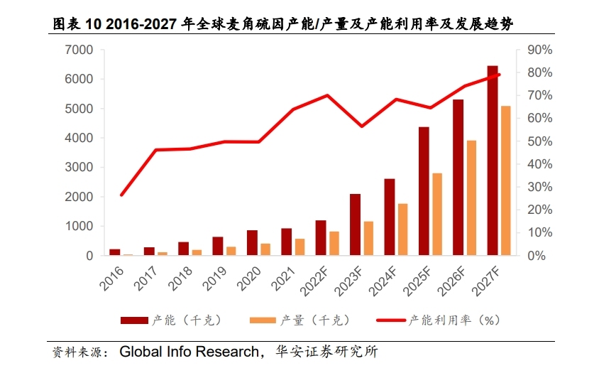 华安证券2022年研报介绍,2020年,全球麦角硫因市场销售额为9680万美元,市场主要由欧洲和北美所占据。全球麦角硫因的主要制造商有Tetrahedron,Mironova Labs,Blue California和成都健腾生物公司,Tetrahedron占有全球市场份额的 58%。近年来麦角硫因市场发展迅速,全球销量由2016年的220千克大幅上升至2021年的591.2千克,据Global InfoResearch 预计2027年麦角硫因全球销售额将达到8.104亿美元,2021-2027年复合增长率为 36.17%。