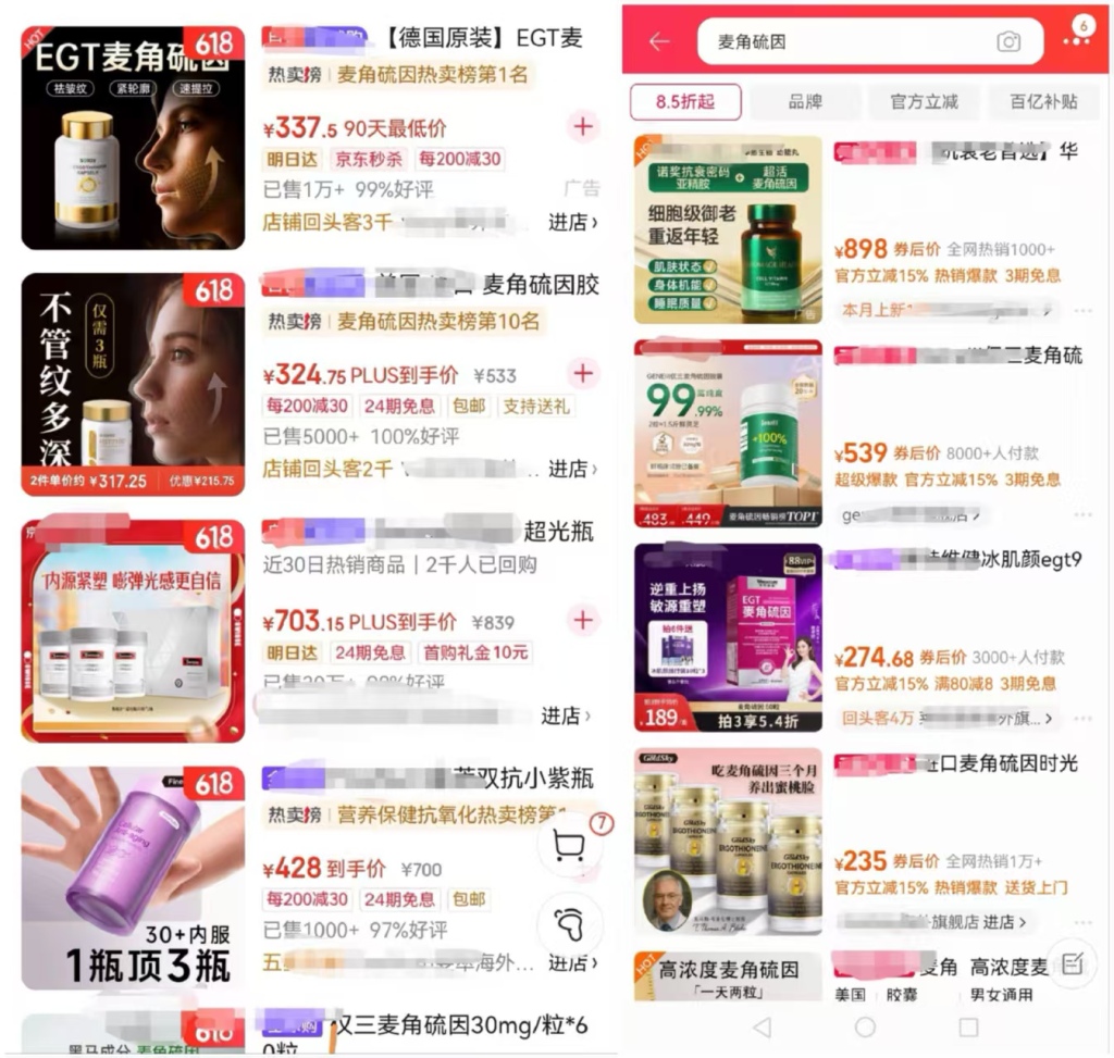 尽管麦角硫因的科学性依然存在争议,但一个毫无争议的事实是麦角硫因这一赛道已然吸引了众多企业入局。在电商平台,以“麦角硫因”为关键词进行搜索,可出现保健品、化妆品等多种结果。