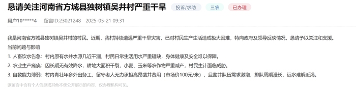 此外,河南南阳市方城县独树镇吴井村村民呼吁抗旱支援:“水井水源几近干涸”,“耕地大面积干裂,小麦、玉米等农作物严重减产”,“留守老人无力承担凿井费。”