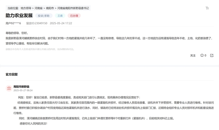对此,新野县委表示,经核查,该村民12亩责任田的机井因井管损坏无法使用。贾桥村委立即协调其使用邻近机井应急,同时镇政府向上级申报维修。“近期将组织专业人员修缮,并已申请在周边8个村新打灌溉机井。”