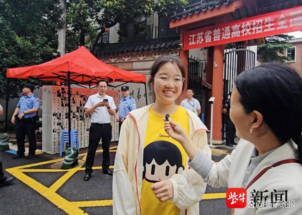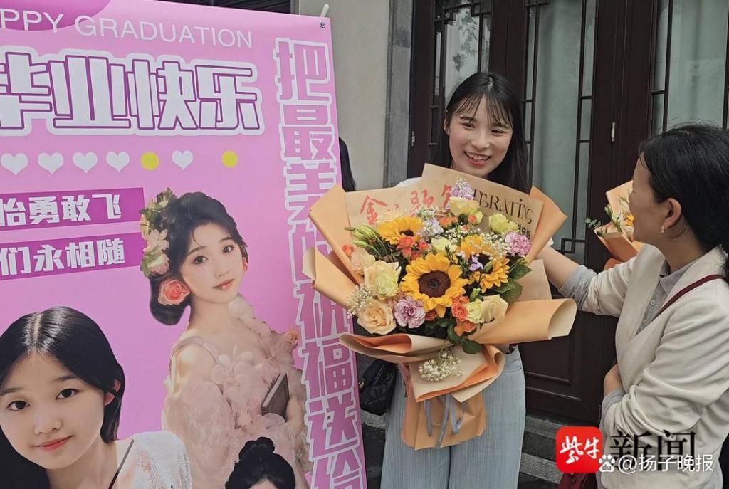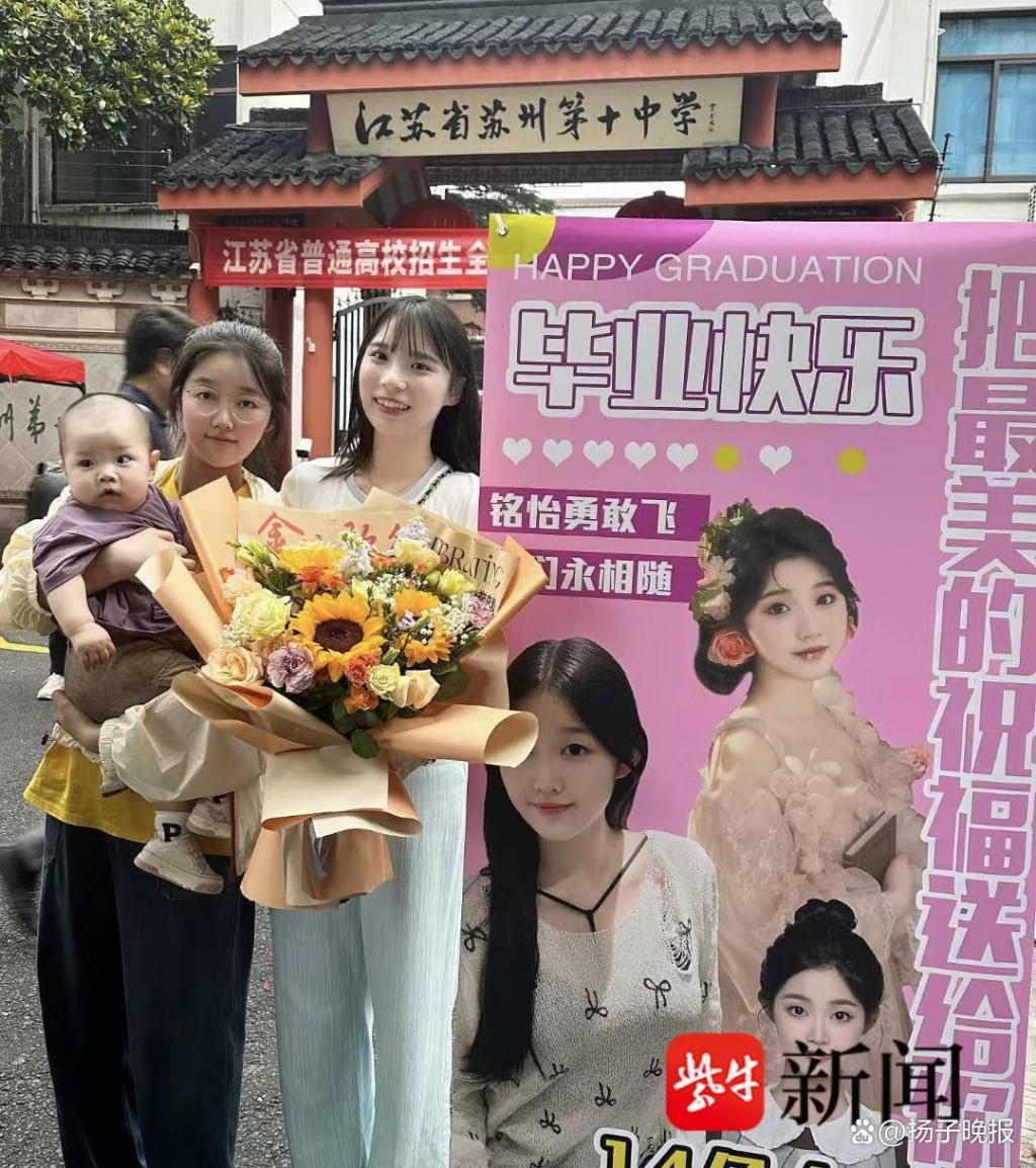 晚上 6 点,记者来到苏州第十中学考点看到,尽管距离考试结束还有 15 分钟,校门口的小巷子里已经围满了手捧鲜花、迎接考生的家长们。其中,一张彩色易拉宝海报格外显眼,海报上写着 " 把最美的祝福送给你——毕业快乐!铭怡勇敢飞,我们永相随。" 该考生的妈妈告诉记者,易拉宝海报是孩子姐姐专门为她设计、制作的。