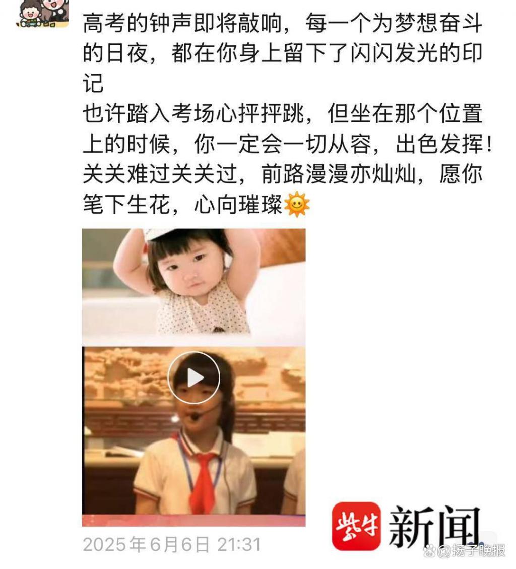 在这次妹妹高考的前一天,姐姐还用妹妹从小到大的重要成长照片制作成了一个祝福视频,并发朋友圈写道:" 高考的钟声即将敲响,每一个为梦想奋斗的日夜,都在你身上留下了闪闪发光的印记 …… 你一定会一切从容、出色发挥!愿你笔下生花,心向璀璨!"