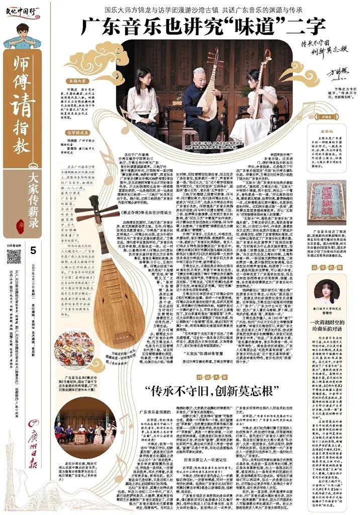 作为岭南文化的三大瑰宝之一,广东音乐是广府人生活的生动缩影,也是无数海外华人难以忘怀的故土乡音。广东音乐为何发源于沙湾?有哪些特点?应当如何创新发展?广州日报访学团和著名国乐艺术家方锦龙一起漫游沙湾古镇,在美妙的音符中共话广东音乐的渊源与传承。
