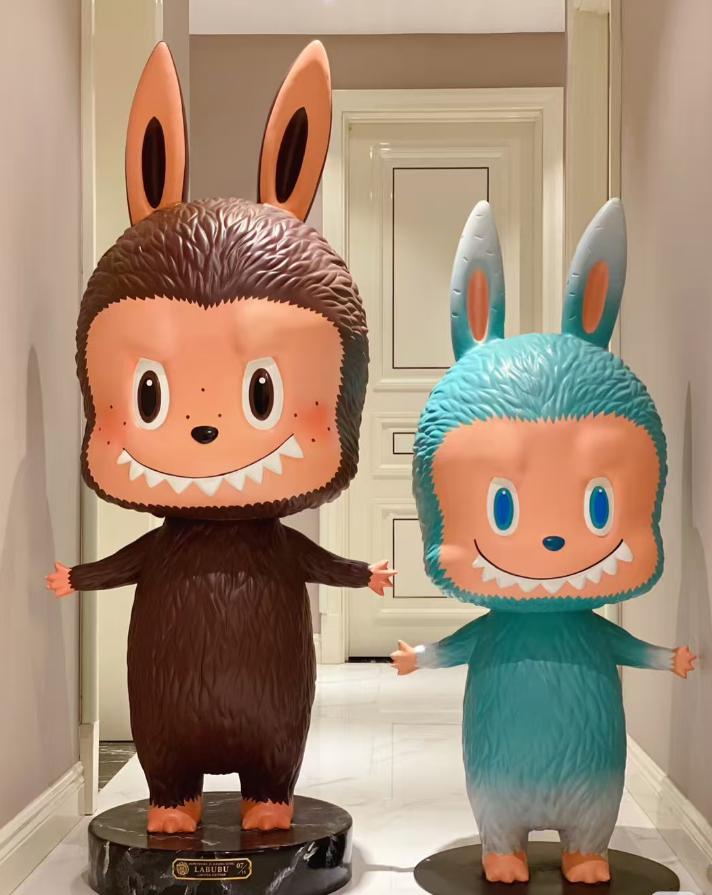 这两只的合计价格 10 多万元,棕色款其实略贵于薄荷色,因为它体积更大,身高 1.6 米、气场特别强,也有属于初版 LABUBU 的原色——棕色带着 " 小雀斑 "。