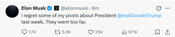 马斯克11日在社交媒体上发文说:“我对自己上周发的关于总统特朗普的一些帖文感到后悔。它们太过了。”