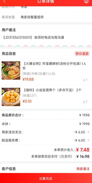 前段时间,一张 " 京东外卖收支明细 " 显示一个顾客下单 16.98 元,商家到手只有 7.48 元。